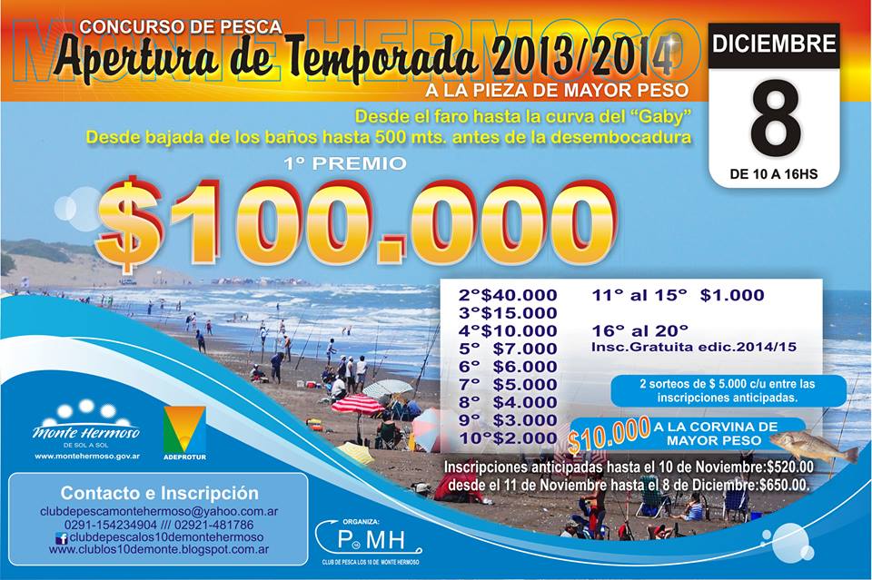 El Club de Pesca “Los 10 de Monte” invitan a participar de la nueva edición del Concurso de Pesca Apertura de Temporada 2013/2014 que se realizará el 8 de diciembre de 10 a 16 horas en nuestra ciudad.